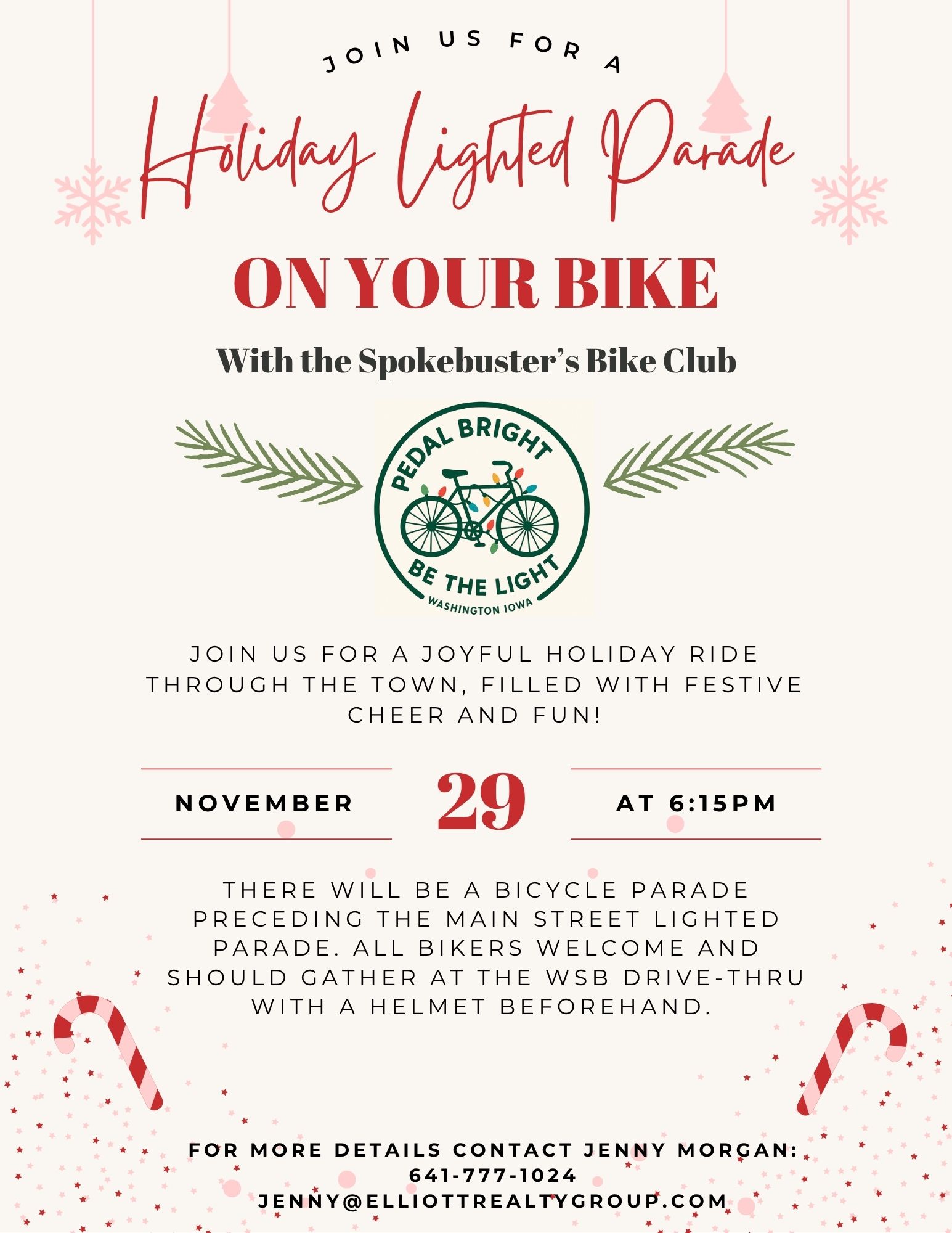 A local cycling club is doing a kids lighted bike parade right before the full parade (so they can ride their bike around the square and then get back in place to watch the actual parade),